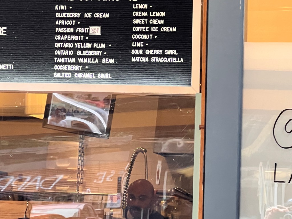 Recent flavours included Apricot, Passion Fruit, Grapefruit, Ontario Plum and Blueberry, Gooseberry and Salted Caramel swirl among others, along with coffee ice cream (not gelato, indicating higher butter fat). We’ll have to swirl back and try those though the Ricardo’s preference is to review those flavours that can be tried on the spot.