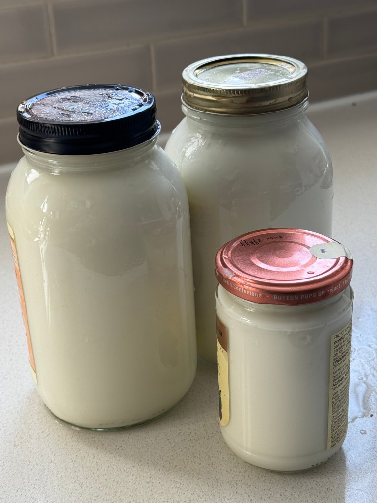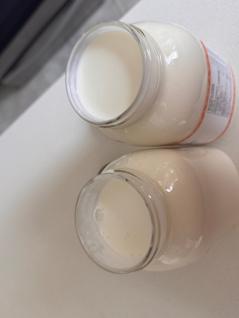 A new product was introduced, the Salton yogurt maker from a company that made gadgets like that. It had a plastic case that housed four or five containers that incubated the yogurt. One still had to boil the milk, cool it and start the yogurt. They were purchased when yogurt wasn’t so readily available It didn’t last very long as soon commercial brands like Danone and AstroBalkan yogurt here in Canada. And that was it for making yogurt. Yogurt is expensive for relatively small quantities and over the years I bought numerous cups of it and never thought of making it again, or even what I’d save. At current prices, 750 grams of plain yogurt is $5.10. Two litres of 3.% milk is about $5.44 and makes an equivalent amount of yogurt.